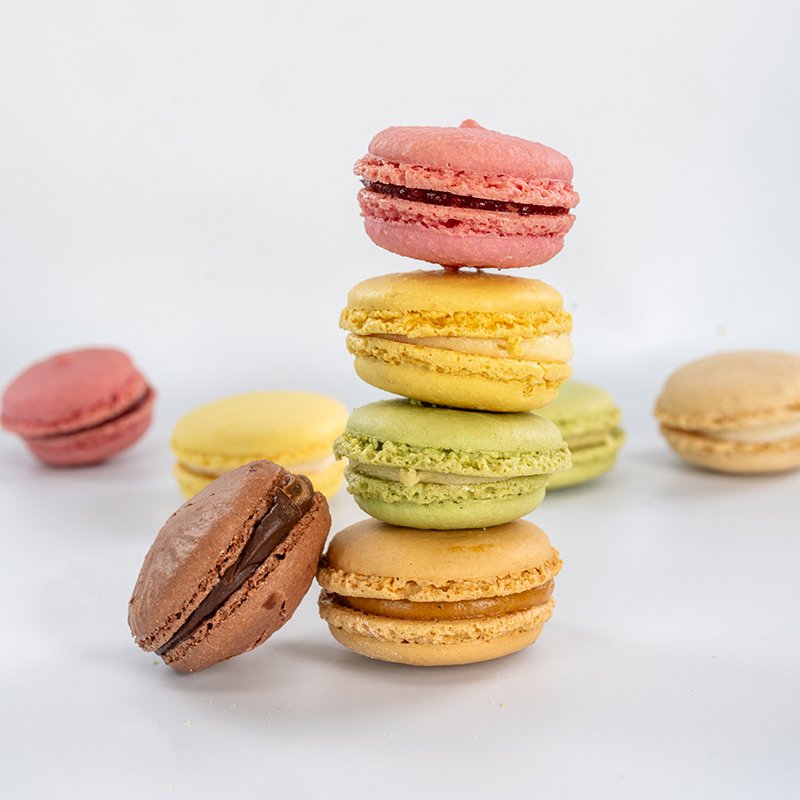 Un assortiment de macarons aux saveurs équilibrées : pistache, vanille, framboise, citron, chocolat et caramel.