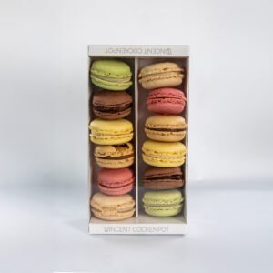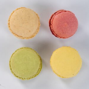 Un assortiment de macarons aux saveurs équilibrées : pistache, vanille, framboise, citron, chocolat et caramel.
