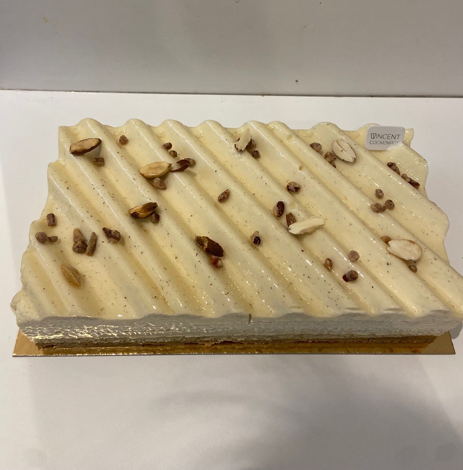 Un croustillant amande, un biscuit moelleux et une mousse intense à la vanille de Madagascar pour une expérience raffinée et gourmande.